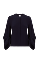 Top cuello caja y botones ocultos. Detalles de mangas drapeadas. Tono azul marino.