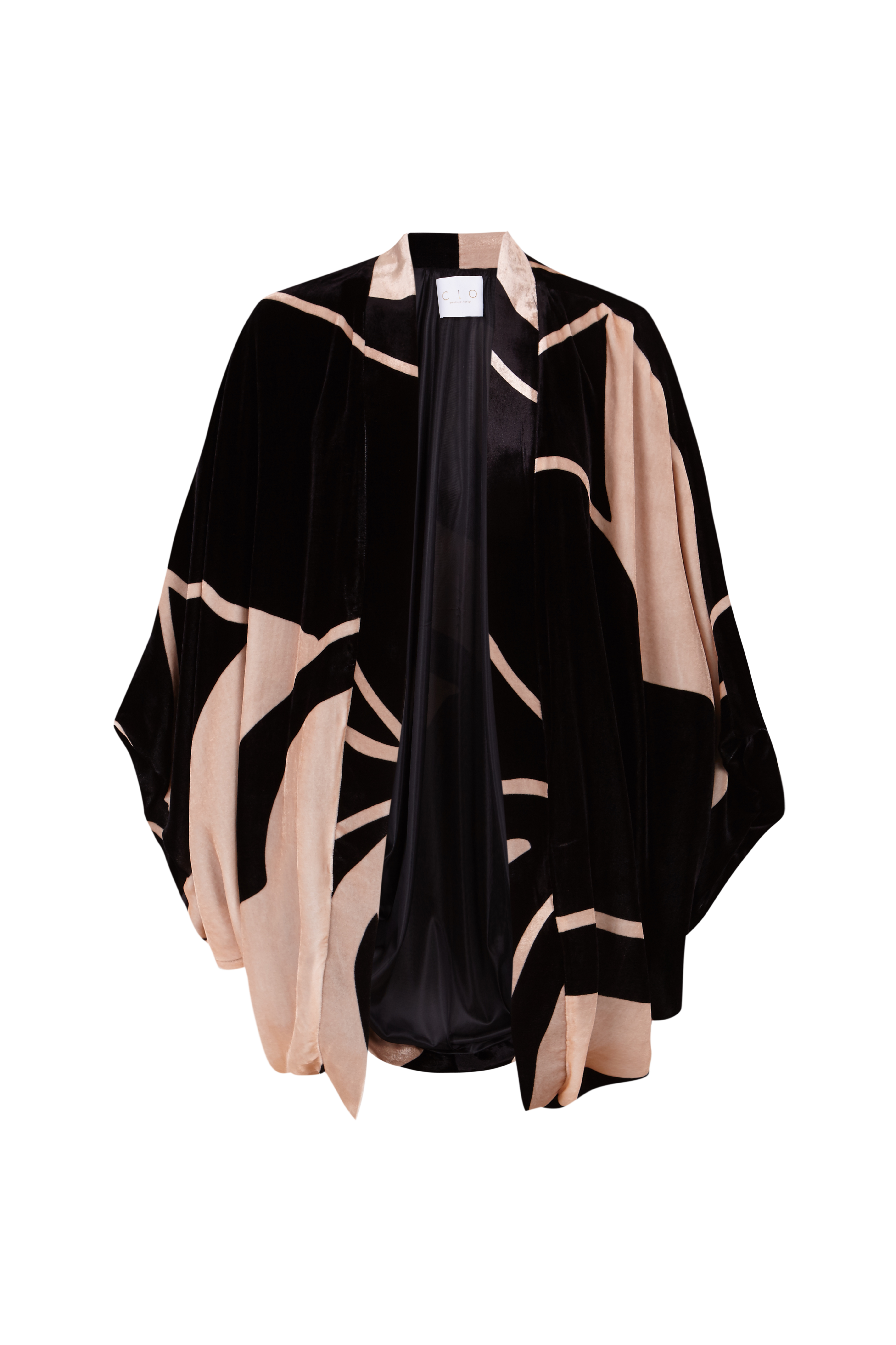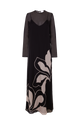 Vestido largo, cuello caja, manga pegada en gasa de seda semitransparente con estampado Dark Orquídea.