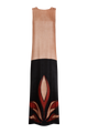 Vestido largo recto de terciopelo, escotado en V en la espalda. En tonos negro y ocre con detalles de flor estampados en la parte inferior.