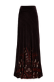 Falda larga corte sirena y cintura alta realizada en terciopelo de seda. Estampado de Jardín Nocturno Marrón.